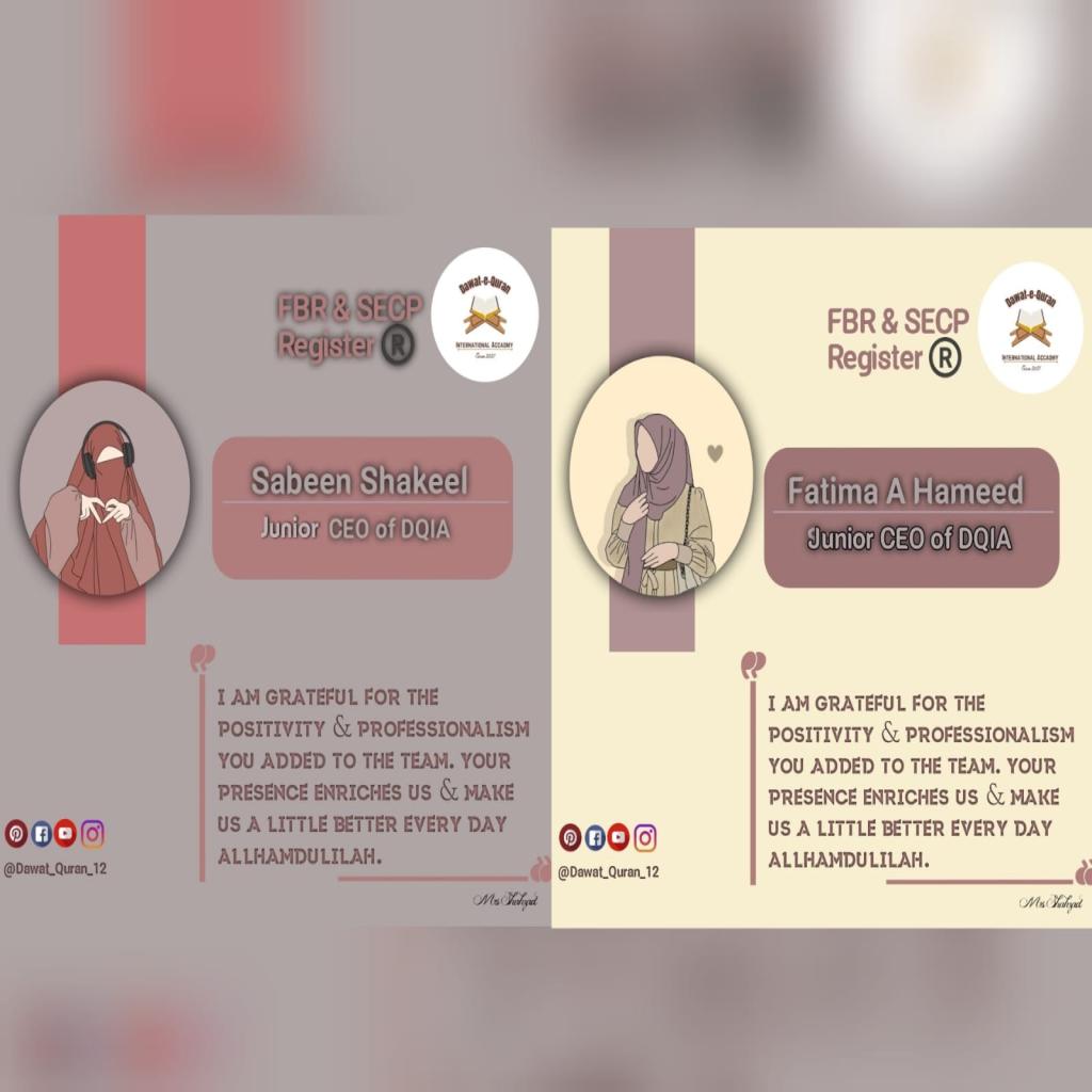 My name is Sabeen Shakeel & Fatima Abdul Hameed, and I am a Junior CEO at the Daawat–e–Quran International Academy. I am a designer and a channel controller, managing visual content and overseeing di...