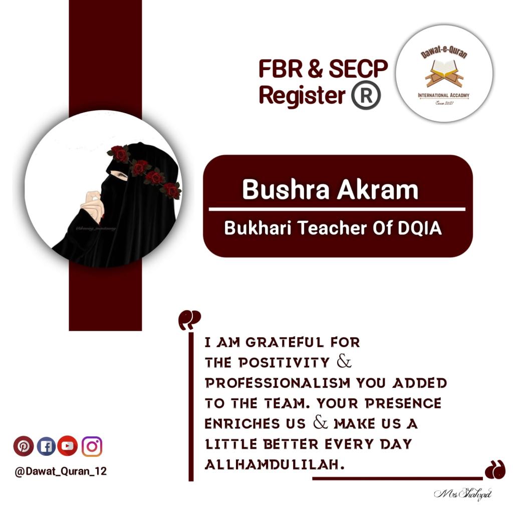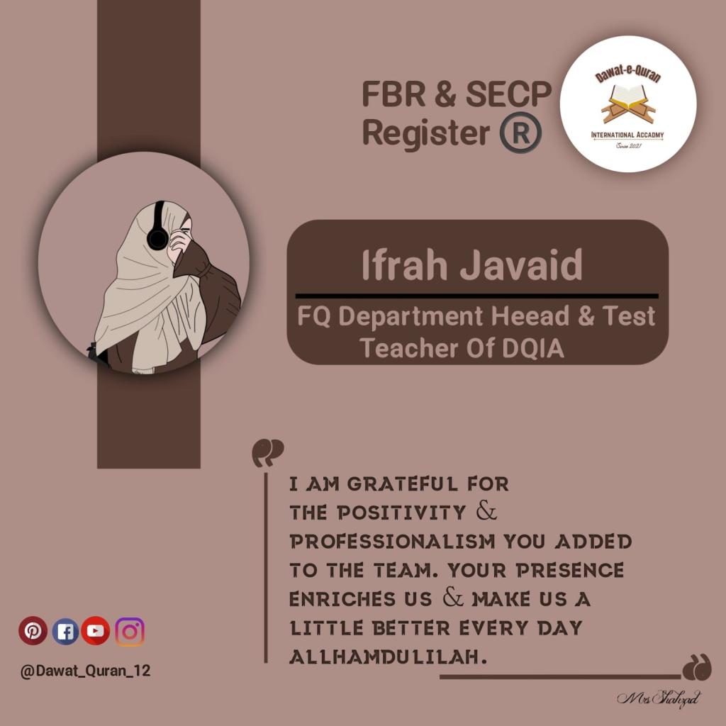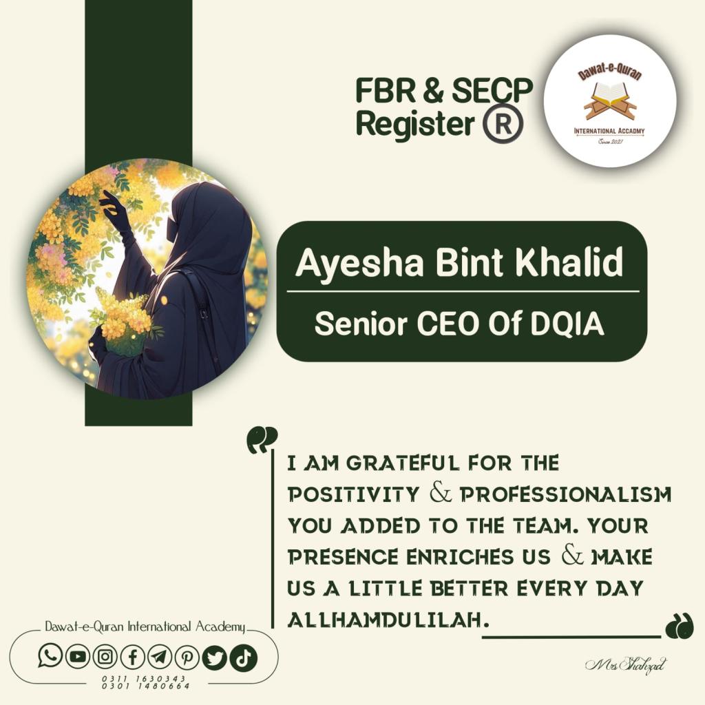 I am Ayesha Bint Khalid , Senior CEO of the Dawat-e-Quran International Academy (DQIA), currently acting as Controller for all departments. As am able, I guide and oversee various kinds of Academic an...